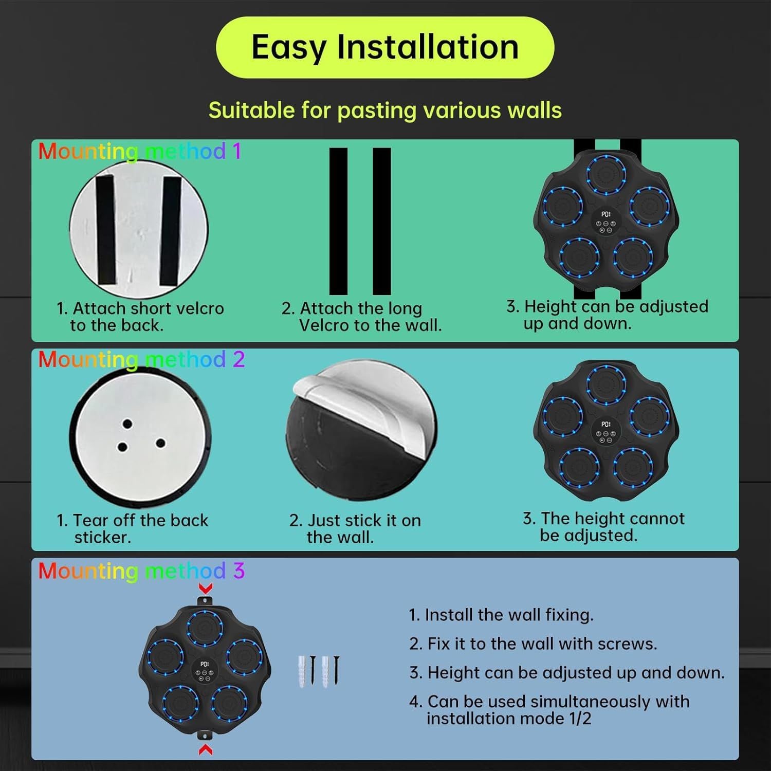 - 2025 New Upgraded Musical Boxing Machine] 5 New Upgraded Buttons: Our boxing machine uses 5 buttons to make operation easier; 3 Upgraded Installation Methods: Unlike other musical boxing machines, we have added a new drilling installation method, allowing you to train in more environments.